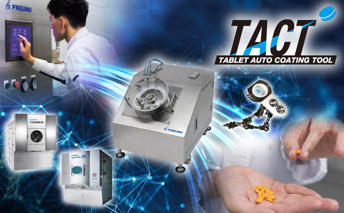 錠剤コーティングPATシステム TACTは、錠剤取得・錠剤数量および重量測定・終点管理および予測まで自動化することが可能です。