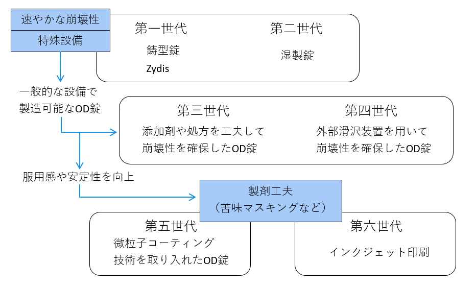 OD錠の進化を語る上で、第一世代から第六世代へと変遷したというとらえ方があります。OD錠の進化の変遷を、図1に示します。