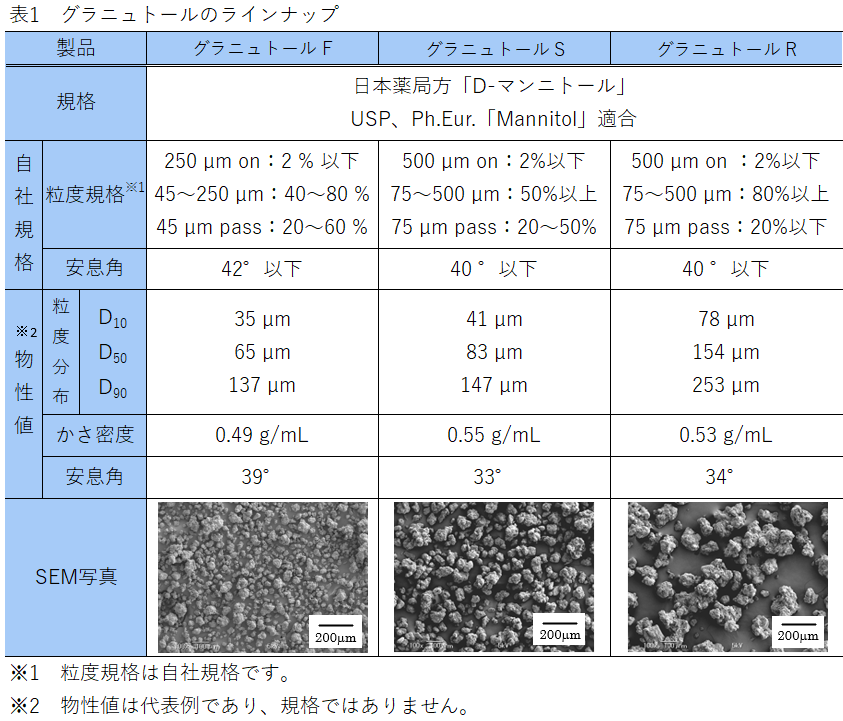 OD錠に適した賦形剤には、溶解性、成形性、吸湿安定性に優れていることが求められます。多用されているマンニトールは、溶解性、吸湿安定性に優れ、清涼感のある甘味や薬物との反応性の低さが評価されています。成形性はやや劣りますが、マンニトールの結晶を造粒することで、成形性の低さを克服した添加剤が市販されています。造粒マンニトールの一例として、グラニュトール(フロイント産業製)のラインナップを表1に示します。